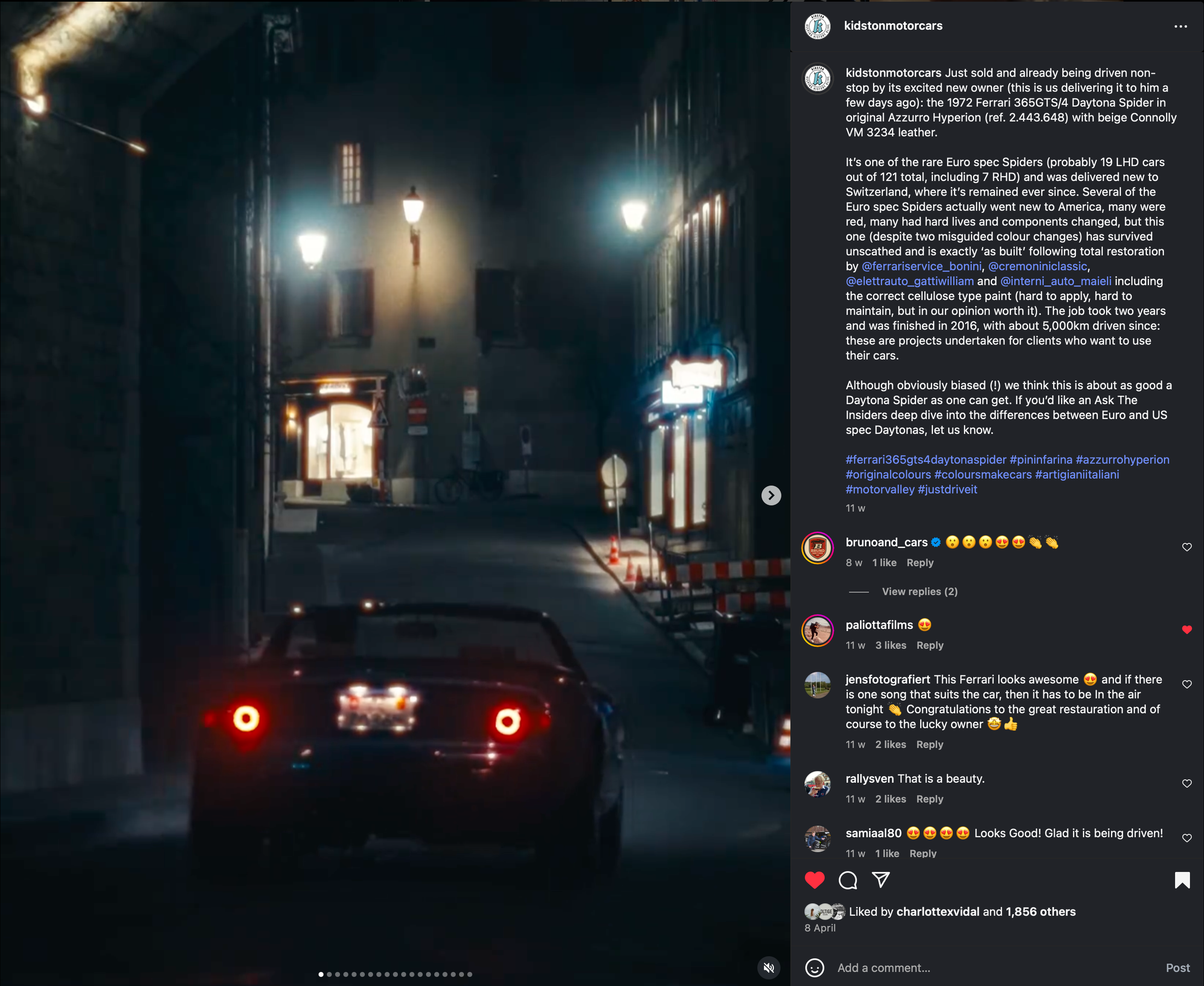 Kidston is renowned in the car collecting world for its market insight and eye for detail. This Instagram carousel spotlighted a 1972 Ferrari 365 S/A Daytona Spider from their collection and generated strong engagement on social media.